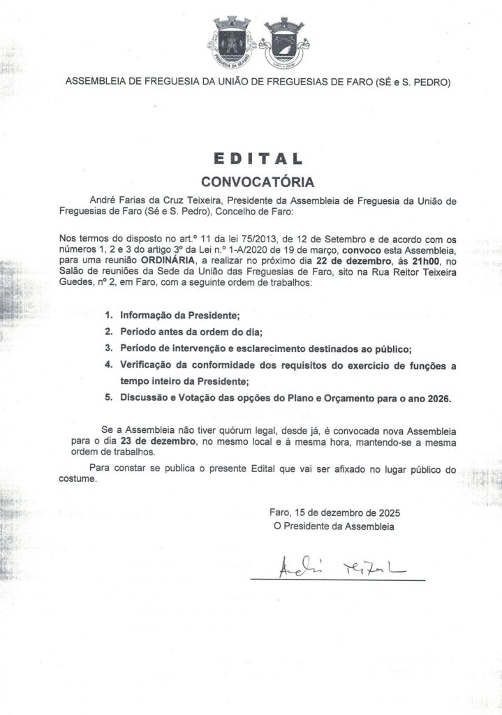 Edital – reunião ordinária da Assembleia de Freguesia, dia 22 de dezembro 2025